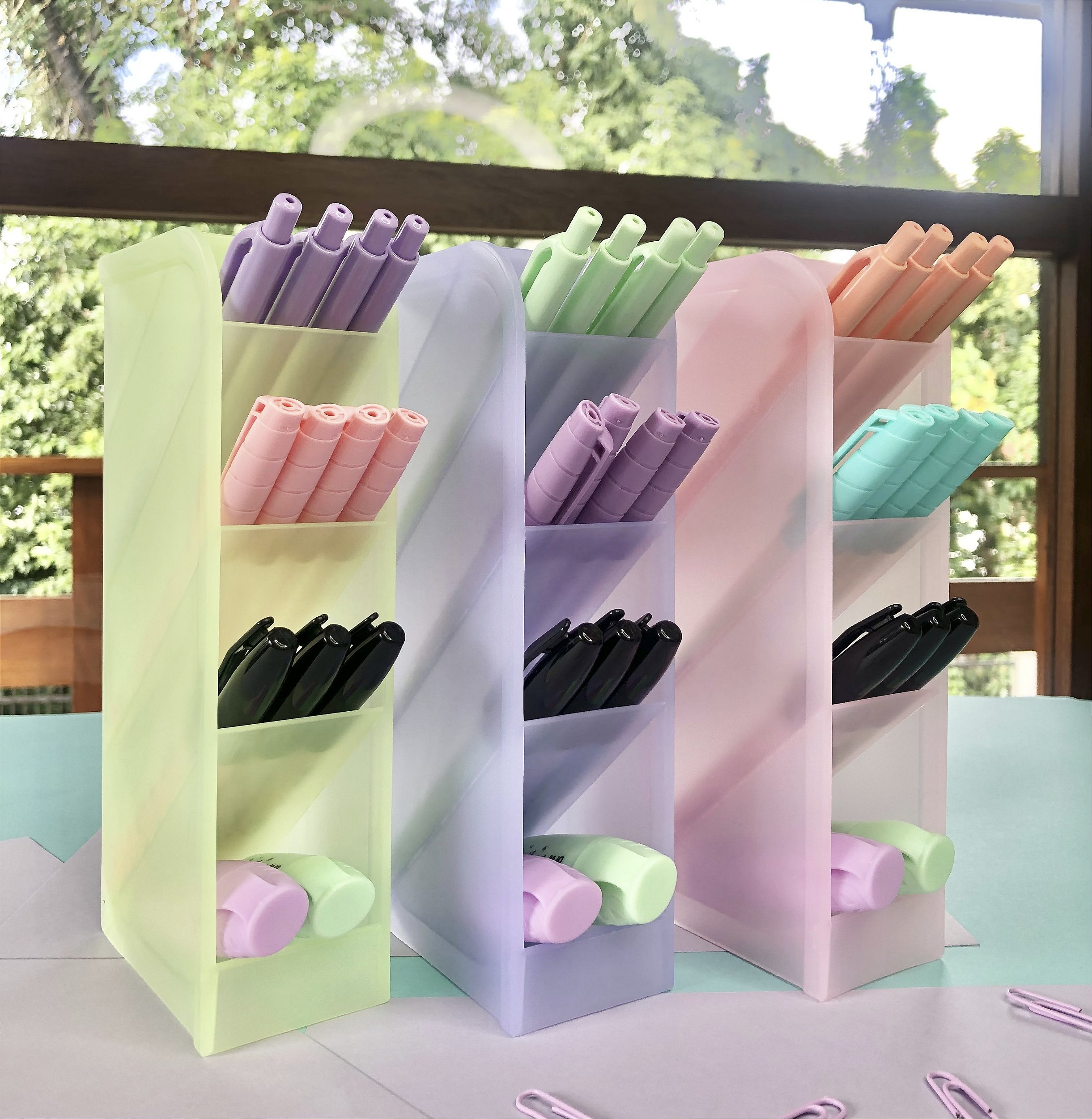 São ótimos para organização de canetas, lápis, lapiseiras e marca textos pra deixar sobre a mesa. Disponível em três cores transparentes: Rosa, verde e lilás.
