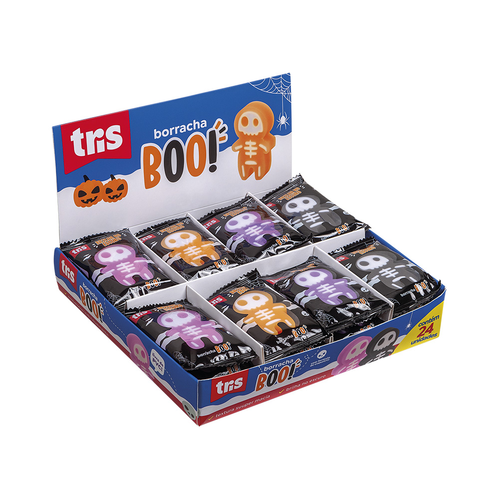 BOO! Com formato divertido de esqueleto e tecnologia que brilha no escuro, essa borracha é perfeita para os amantes de Halloween!